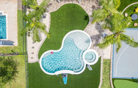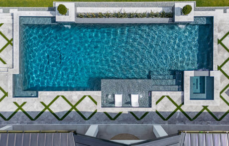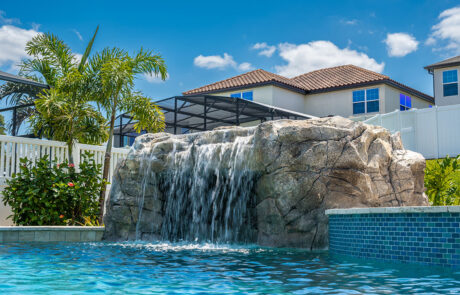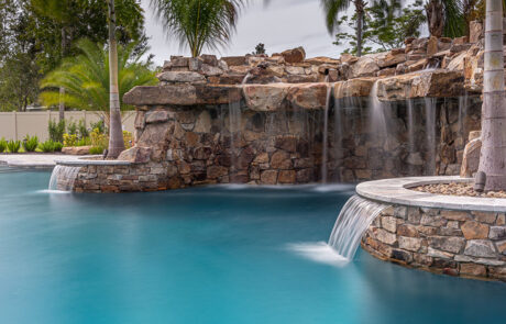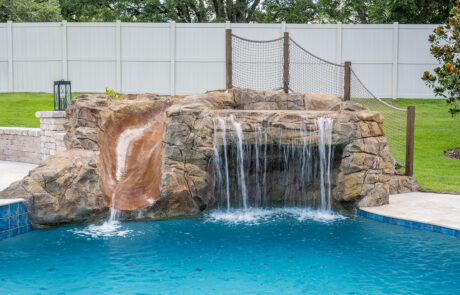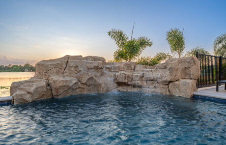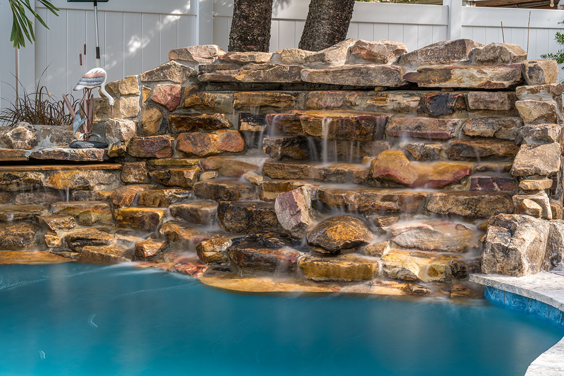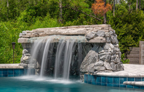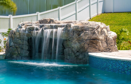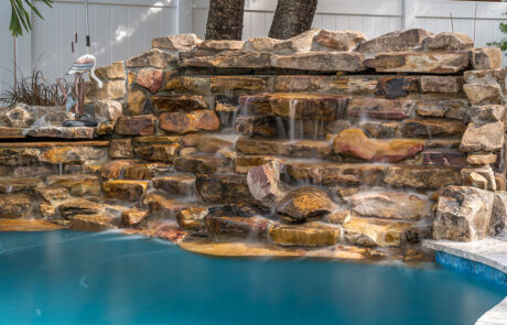 Grottos add an exhilarating aspect to your pool atmosphere! This stone feature has water cascading over the entrance with seating behind the waterfall adding a thrilling and enticing feature.
