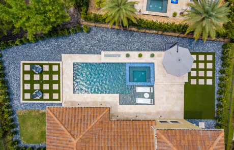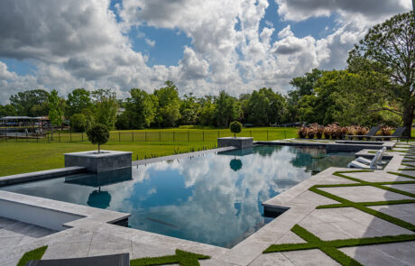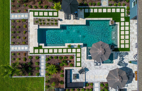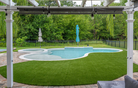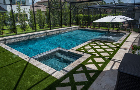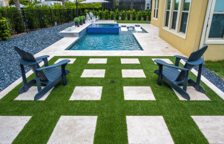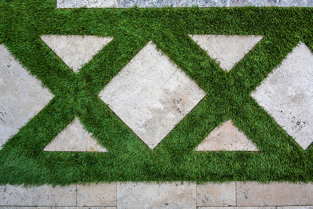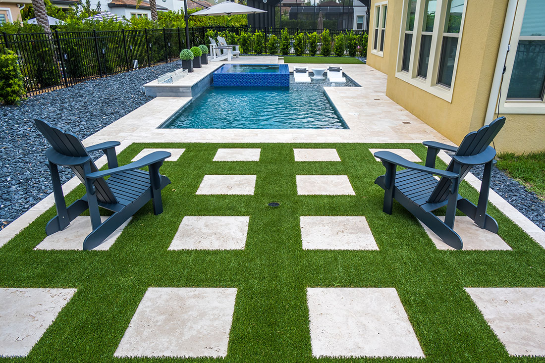 To bring the outdoors in use synthetic turf. It is a grass like material and can cover the entire pool deck or just specific areas. It is a harmonious look as it blends wonderfully with your backyard and allows for less of a separation between your screen room and yard.